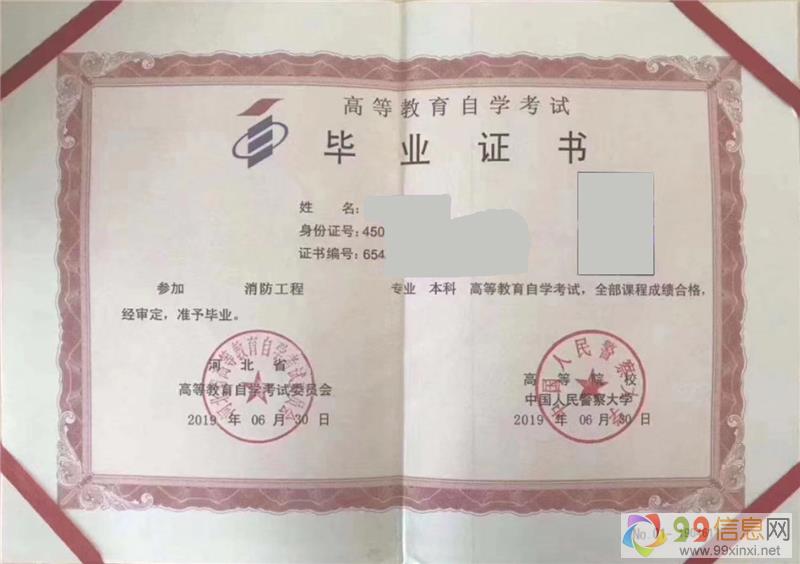 毕业证书:每年的6月、12月统一办理毕业;成绩全部合格后,由河北自考委和中国人民警察大学联合颁发本科学历证书FdR。