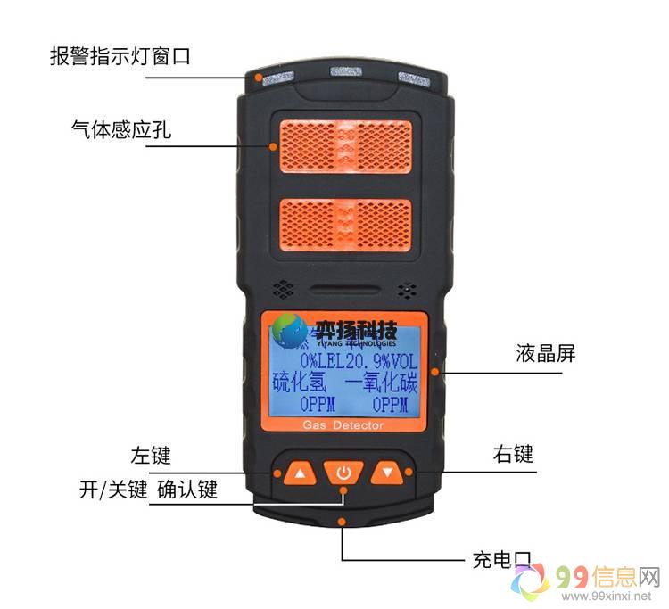 CY-9~9~信~息~网B4in1泵吸式四合一气体检测仪在配备氧气、可燃气体、一氧化碳和硫化氢四种传感器的同时,还配有强力吸气泵,便于检测各种密闭环境中有毒有害气体浓度。根据现场检测环境不同,可定制任意四种气体同时检测。它具有非常清晰的液晶显示屏,持续不断的检测并独立显示四种气体浓度,声光报警提示,保证在非常不利的工作环境下也可以检测危险气体并及时提示工作人员预防。