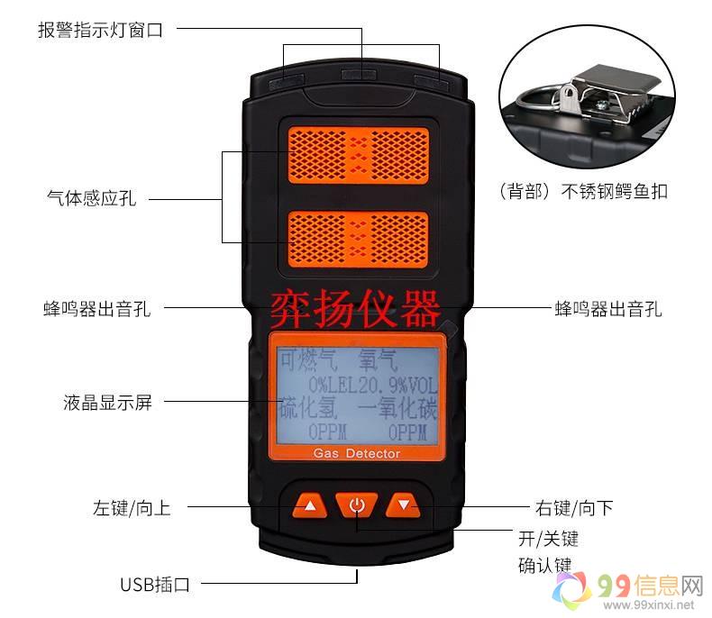 量 程:O2:0-30%vol、Ex:0-100%LEL、CO:0-999ppm、H2S:0-100ppm