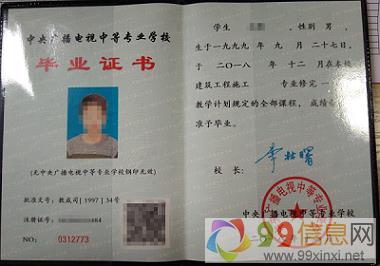 中央广播电视中专学历,真实有效,9.9.x.i.n.x.i.n.e.t8-10个月拿到毕业证。毕业后不用等毕业年限,目前有八个专业可报考: www.99xinxi.net99信息网建筑工程施工、建筑设备安装、机电技术应用、电气技术引用、会计、电子商务、市场营销、老年人服务于管理。 拿到毕业证可直接报考二级建造师、二级消防工程师等,再也不用担心报名、取证、注册等问题。99xinxi.net