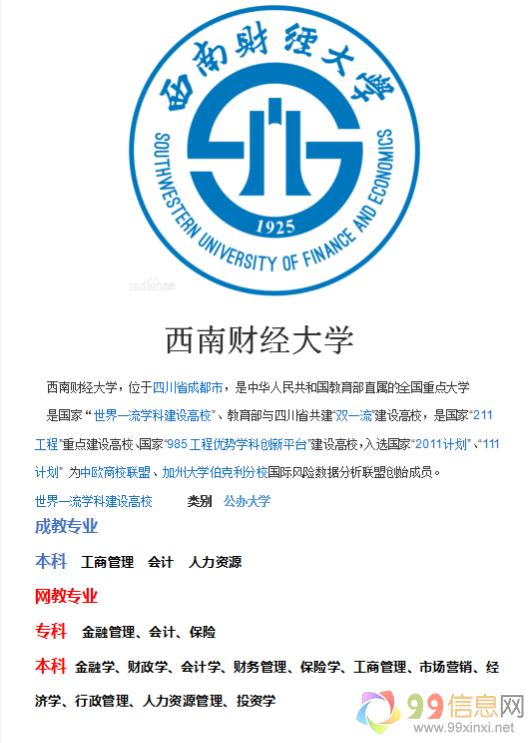 西南财经大学欢迎www.99xinxi.net 位列“双”世界学科建设高校、211工程、www.99xinxi.net99信息网985工程优势学科创新平台;以经济学管理学为主体、金融学为重点的全国重点大学。