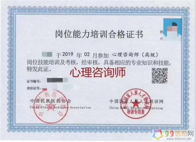 现人社部开始颁发的心理咨询师证书,面向全国进行招生培训,随报随考,两个月拿证。可按照联系方式联系我们详细了解99信息网www.99xinxi.net。