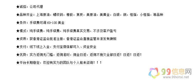 如果你有什么意见和好的建议,你都可以提,这一切都不是问题www.99xinxi.net99信息网。我们只寻求市场能够长久合作共赢的实力公司代理。长久稳定开发市场,我们长久稳定运营项目,同时返佣长久稳定,也是合作给你代理长久稳定的利润和盈利。对于好的建议和意见,我们分分钟钟立刻采纳,只要是有助于合作,有助于开发市场的,增进彼此合作的,一定会采纳的,让你见证一个行业当中一个成功的平台的崛起,同时也是你参与的一个项目的成功。这算是意见很成功和有荣耀的一件事吧。