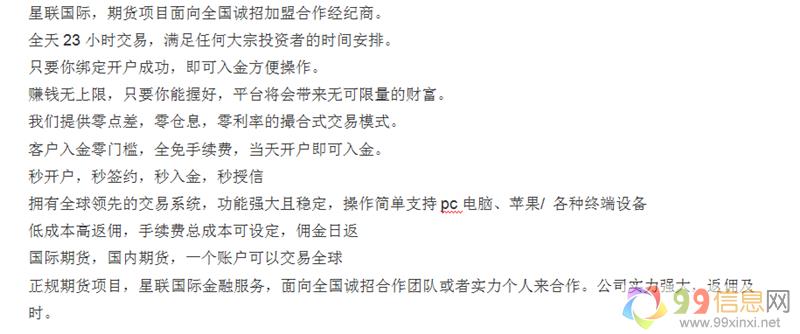 星联国际我们做项目的态度和事实,以后在合作过程中,凡是我们合作的代理商都可以感受下我们对于项目的态度,对于合作商的态度,绝对会让每一个合作者称赞。也可以去同行那里去咨询一下我们的项目的名气和信誉,绝对是同行业招商当中的一流服务9_9_信_息_网。
