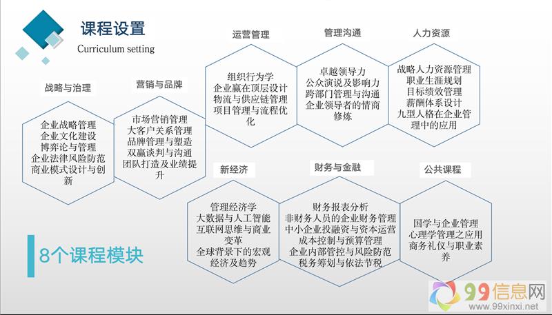 答:课程设置:核心课程+选修课程+沙盘模拟+案例分析,每月安排2-3次面授课,在周日进行全天授课;同时还有一些课外活动,如商务考察+军训拓展+课外交流+移动大课堂等,让学员通过一系列的系统学习过程,熟悉掌握企业管理的各个模块,有一个全盘经营企业的理念及经营人所应有的格局来源www.99xinxi.net。
