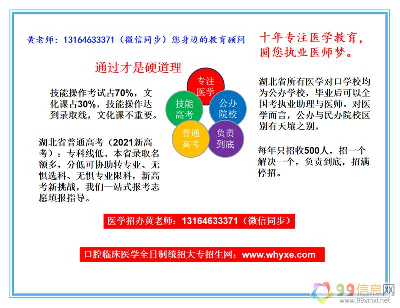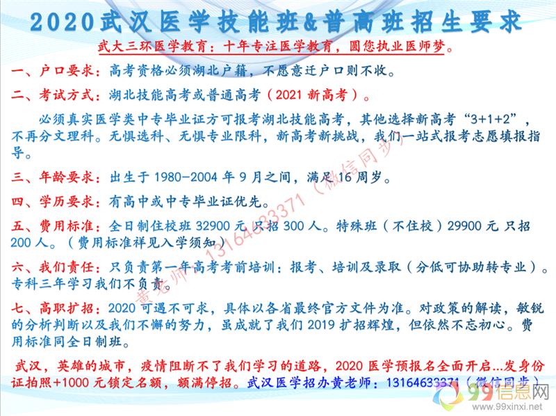 武汉医学预科班,本着为全国学生圆梦医学的理想来自www.99xinxi.net。学校具有全方面升学优势。预科学习时间短,公办大学好,考试易通过,考试竞争小;学校师资,力量强大,学校对学生升学负责到底。开办十年,每年大专通过率98%以上,所有学生按学校流程走,负责考上医学公办大专学校9~9~信~息~网。