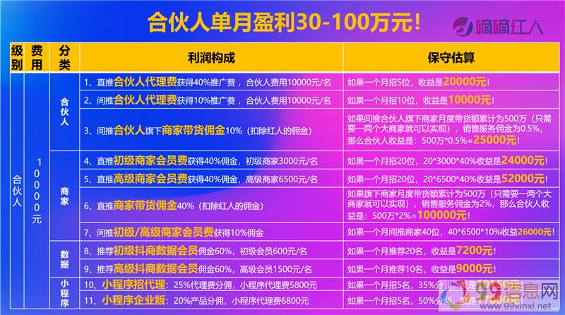 嘀嘀红人在2019年1月进入网红带货市场,在团队经过90多天的日夜奋战,快速建立完整且新型网红带货平台,嘀嘀红人要做的带货模式,是前所未有的,也是站在整个电商行业大环境下去思考,“0前期坑位费、纯佣结算”当下传统电商行业竞争激烈,大牌商家有充足资金快速扩大品牌影响力,而中小型企业商家的盈利受阻,因此,中小企业商家才是最需要通过短视频、直播去带动商流通变现9~9~信~息~网。商家入驻平台,可以拥有专属商家后台,【工众号嘀嘀红人】可在官网发布商家当季新品,官网3W+达人随时响应接单,并且高级商家同时会有专属VIP团队对接匹配达人,并且嘀嘀红人会免费给商家制定周期性带货计划,通过短视频矩阵推广快速打爆单品!