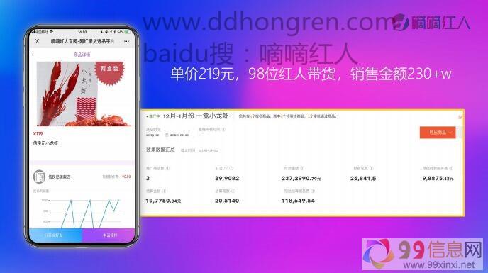 今年年货节期间,217名优质网红给嘉士利饼干带货,带货销售额在活动期间达到了惊人的580w+,在此期间,还有98名优质网红给食品小龙虾带货,虽说没有饼干卖的那么多,但是好歹也是两百多万呐。98名网红同时带货也就算了,217名是什么概念?就意味着你不用担心没有货带,从嘀嘀红人创办到现在,就一直在招募优质网红,因为有着高效率的带货模式,也是有着越来越多的商家入驻嘀嘀红人,现如今入驻的商家就超过了6500家aLL。嘀嘀红人受欢迎的原因是什么?自然是有着能够吸引商家的东西,商家担心的是什么?佣金贵,一旦合作了之后,带货效果没达到怎么办?不用担心,嘀嘀红人不需要任何的前期费用,并且以纯佣金带货的模式给商家带货,商家可以放心的把产品就给嘀嘀红人的网红。