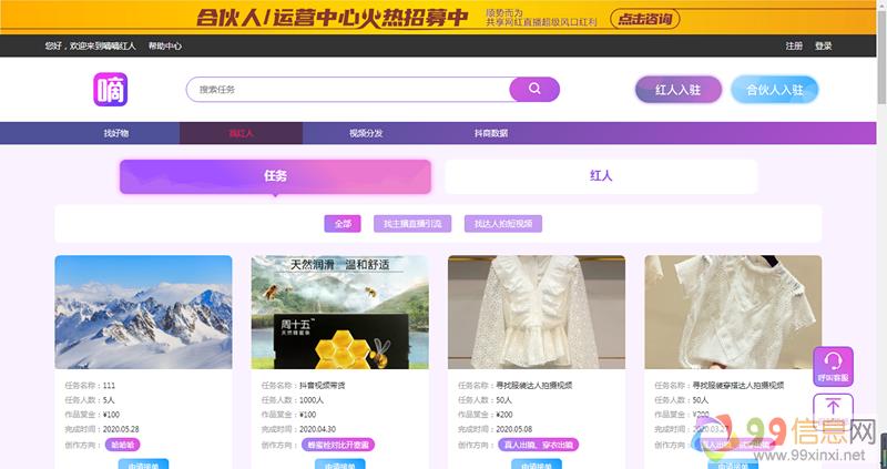 在“互联网+”这种新的经济模式下,“大众创业, 万众创新”将不再是口号,而将真正的成为现实。可以说,在网红经济时代,企业间或者商家比拼的不再是产品和服.务的创新,而是对瞬息万变的市场信息的把握、精确的定位和快速的反应9.9.信.息.网。内容制作更加丰富,互联网的普及带 来了传播渠道门槛的降低,不需要过高的人员和成本投入,人人都可以是自媒体, 这大大激发了全民娱乐内容的生产和创新热情,但也导致内容的竞争更加激烈,短平快的生产周期下更优质、更细分的内容资源才能脱颖而出,吸引粉丝注意;就像嘀嘀红人的纯佣带货模式一样,先拿网红的质量来说,每一个都是有着几十万到百万不等的粉丝,并且粉丝活跃度足够高,质量也好,网红的视频和直播内容也丰富,每月的带货销售量都有过万的。作为国内少数的纯佣带货平台,先不说带货能力的强度,单单是32000+的网红在线接单就已经足够让人叹为观止,有着优良的信用度以及带货效率,已经吸引了超过7000的商家入驻,今年的年货节期间,由315位优质网红给嘉利士饼干和食品小龙虾带货,分别达到了580w和230w的销售额,这种多对一的模式真正意义上的造就了平台带货的优势,嘀嘀红人共享网红带货平台,能够给你一个高效率,低风险的带货模式9+9+信+息+网。【工众號:嘀嘀红人】