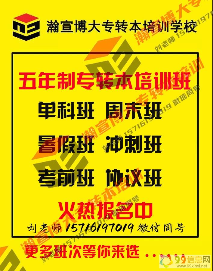 五年制专转本是高职生获得全日制本科学历的最后希望,报名只是第一步,如何跨过艰难的备考这一关至关重要,无锡瀚宣博大专转本刘老师告诉你,瀚宣博大五年制专转本培训辅导班,十三年来专业做五年制专转本辅导,有专业的人指导将会事半功倍,不管你是单纯地想巩固学习,还是面临即将到来的考试临时报佛脚,瀚宣博大都可以根据不同学生的需求,设定不同的班次,一切只为得到一个最好的结果而努力,欢迎各位有转本意愿的高职生,到无锡瀚宣博大专转本学习,预约课程试听找刘老师一五七1六1九七凌一九微信同号,免费领取招生简章以及预约试听课。