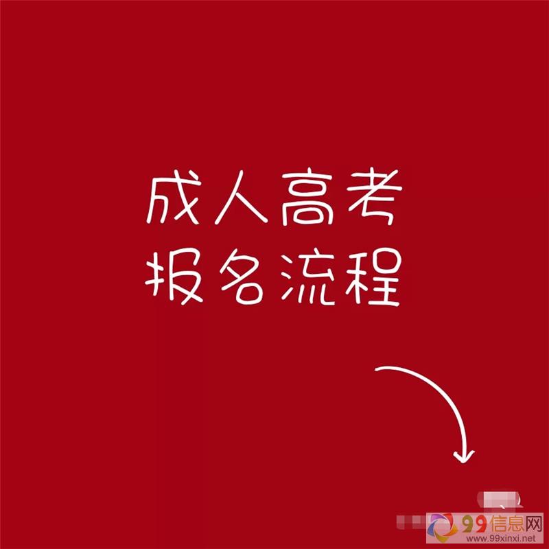 学校即日起接受预定报名(3-8月)9~9~信~息~网——考生咨询了解成考——考生选择报考层次/专业,填写报名表——名程教育中心老师统一负责帮考生网上预报名(8月底)——组织考生现场电子摄像指纹采集进行确认报名(9月初)——参加全国统一的成人高考入学考试(1099信息网月第三个周末,具体时间以准考证时间为准)——查询成绩(11月在网上查询)——录取查询(12月),通知书发放(12月底到次年1月),缴第一年学费——新生注册入学(明年3月)欢迎www.99xinxi.net