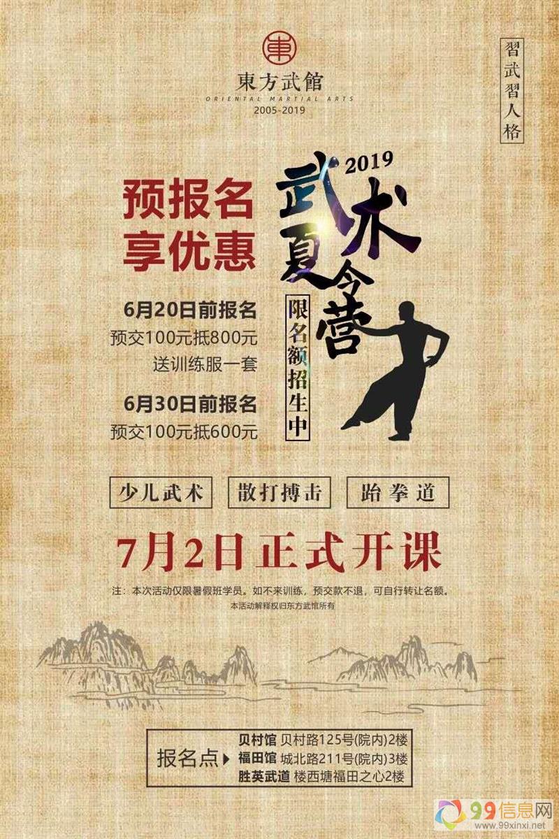 东方武馆暑假班预交100抵800报名优惠活动最后1天,武馆开设:少儿武术、散打搏击、跆拳道等课程,习武、习人格,选择东方武馆选的是一份信任,学费打折、教学绝不打折。WbK