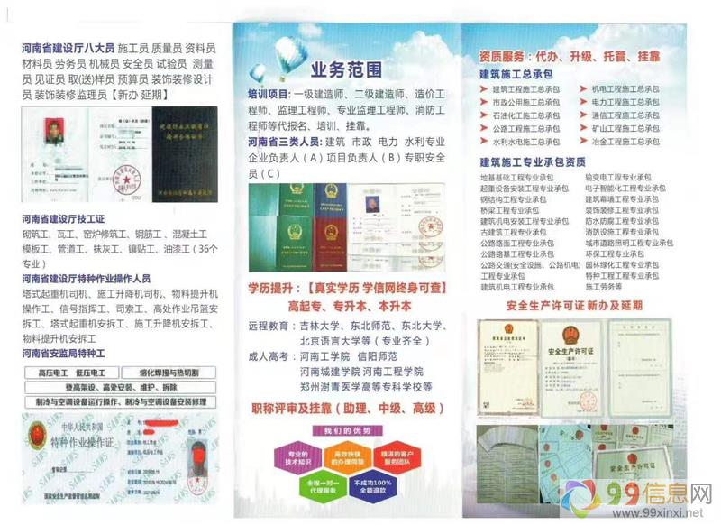 河南省特种作业证特种工证去哪办,河南省郑州市特种工去哪办?河南省洛阳特种工去哪办?河南省安监局特种工去哪办、河南省安监局特种工公正包含电工焊工架子工,另外还有特种高压,如高压试验,继电保护,电力电缆等,该证是国网省网都可以查询,全国通用,用途包含施工现场人员,安全生产许可证办理,电工、焊工、登高工操作证(全国通用)装修试资质办理等