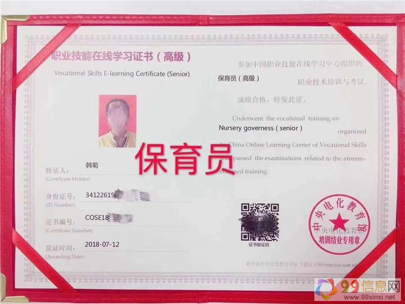 月嫂上岗证就是保育员资格证www.99xinxi.net99信息网