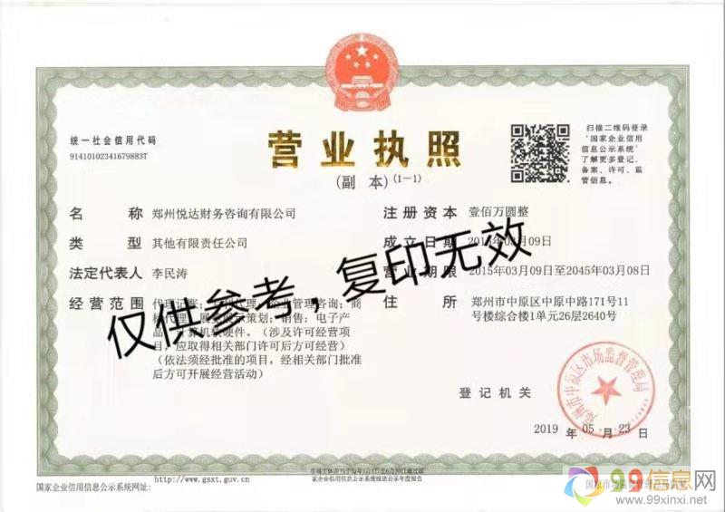 郑州悦达财务咨询有限公司主要经营悦达工商提供:工商注册,疑难核名,疑难审批,特殊行业办理,集团公司申办,投资类金融类资产管理类公司注册,投资担保公司注册,典当行注册,寄卖公司注册,不动产公司注册,基金管理公司注册等, 代理记账、会计外包、 报税服务、 财务顾问,内外资工商注册 内外资工商变更 申请一般纳税人 办理五险一金 企业年检 记账报税等一站式服务。
